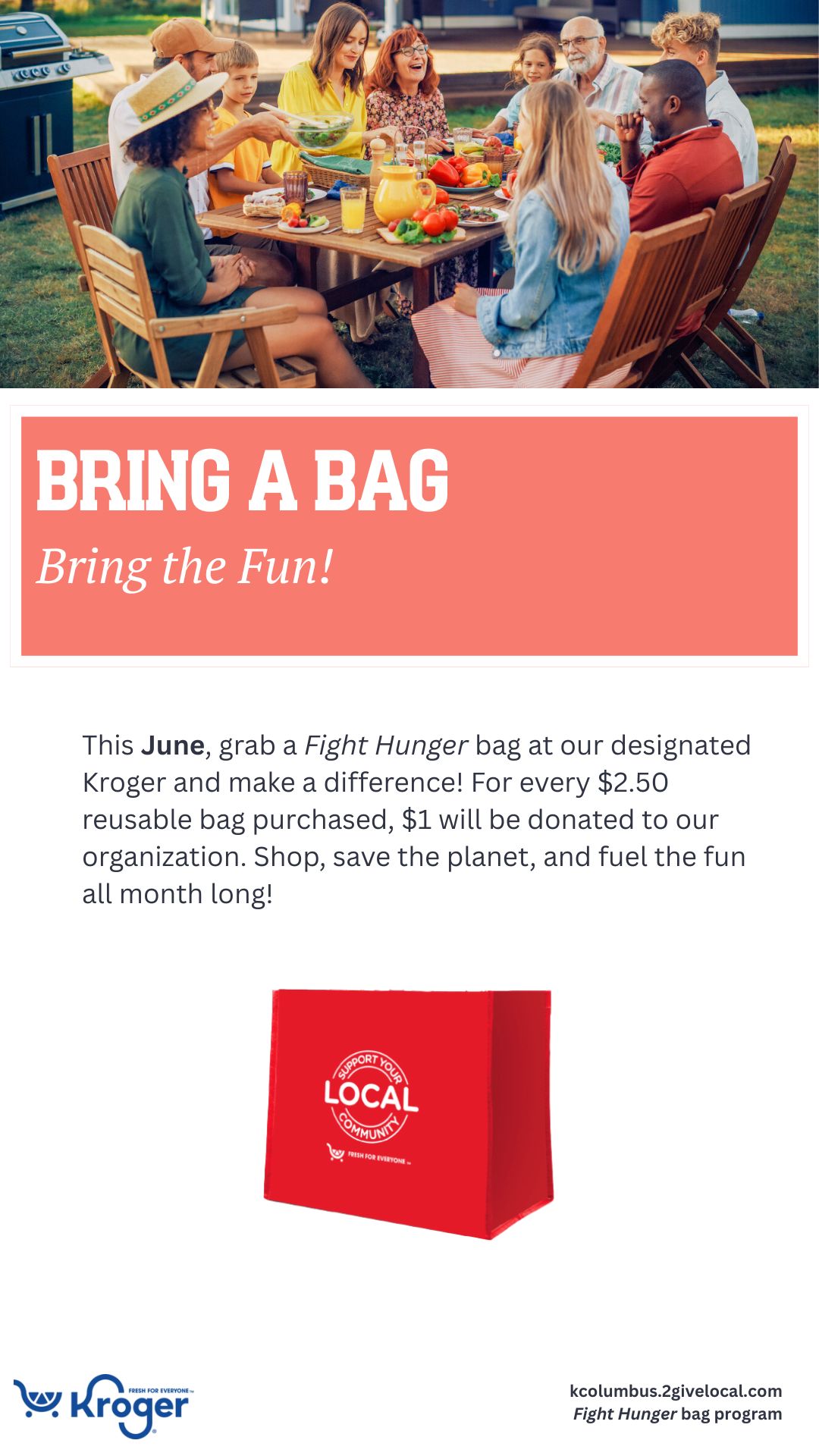 Your selection period for the Fight Hunger bag program is May and June. Use the tools below to let your community know they can support you in June at your selected Kroger location(s)!